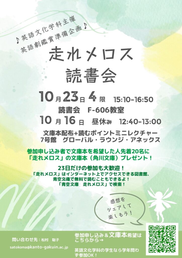 10月末に「走れメロス」の英語劇の公演が大学内で行われることになりました。観劇前に気分を高め、より深く理解するための準備企画として、初めて読書会を開催しました。