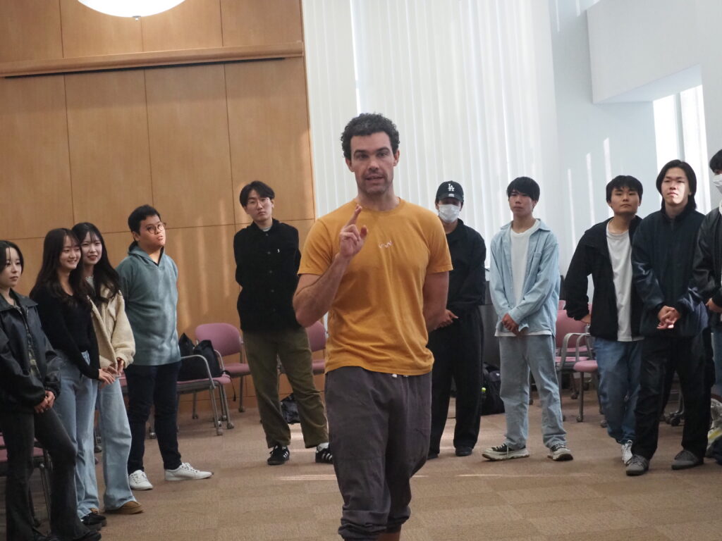 公演に先立って、英語劇のワークショップが行われ、英語文化学科の2年生を中心に約30名の学生が参加してくれました。