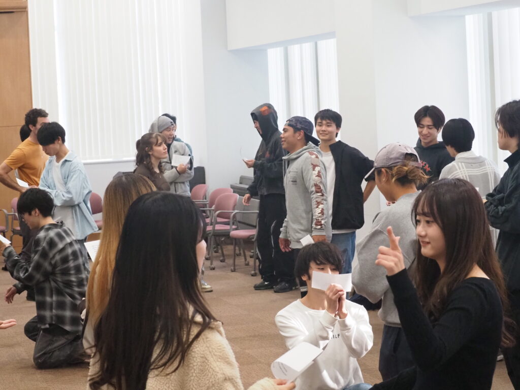 初めての英語劇ワークショップに少し緊張気味の学生たちでしたが、アイスブレーキングのゲームで身体を動かすうちに、徐々に笑顔がこぼれるようになりました。